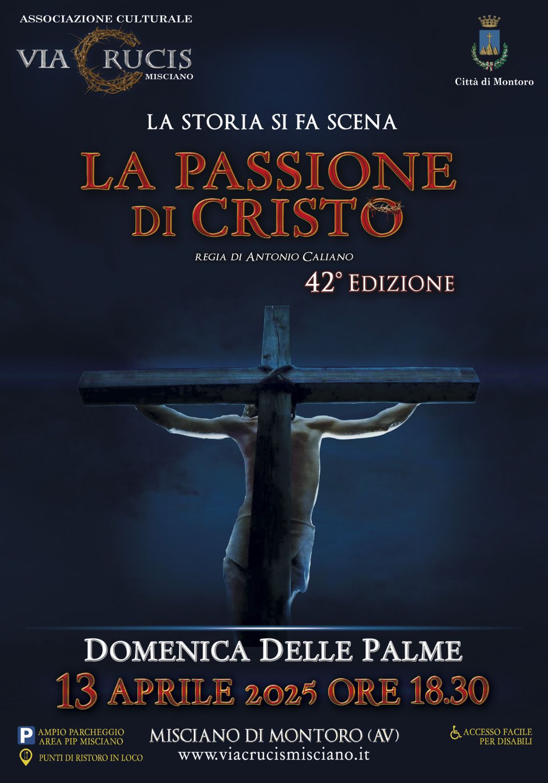 Domenica 13 aprile torna la “Passione di Cristo”, dove è diventata ormai una tradizione pasquale moderna, che quest’anno giunge alla 42a edizione. L’intensa e spettacolare Via Crucis che si celebra nelle strade del piccolo borgo irpino, è curata dall’Associazione culturale APS “Passione di Montoro e vede la partecipazione corale della popolazione con oltre trecento figuranti, che contribuiscono a creare un evento di grande suggestione, sempre più apprezzato dai visitatori che scelgono di assistervi. A partire dalle ore 18.00. Accesso facilitato per i disabili.